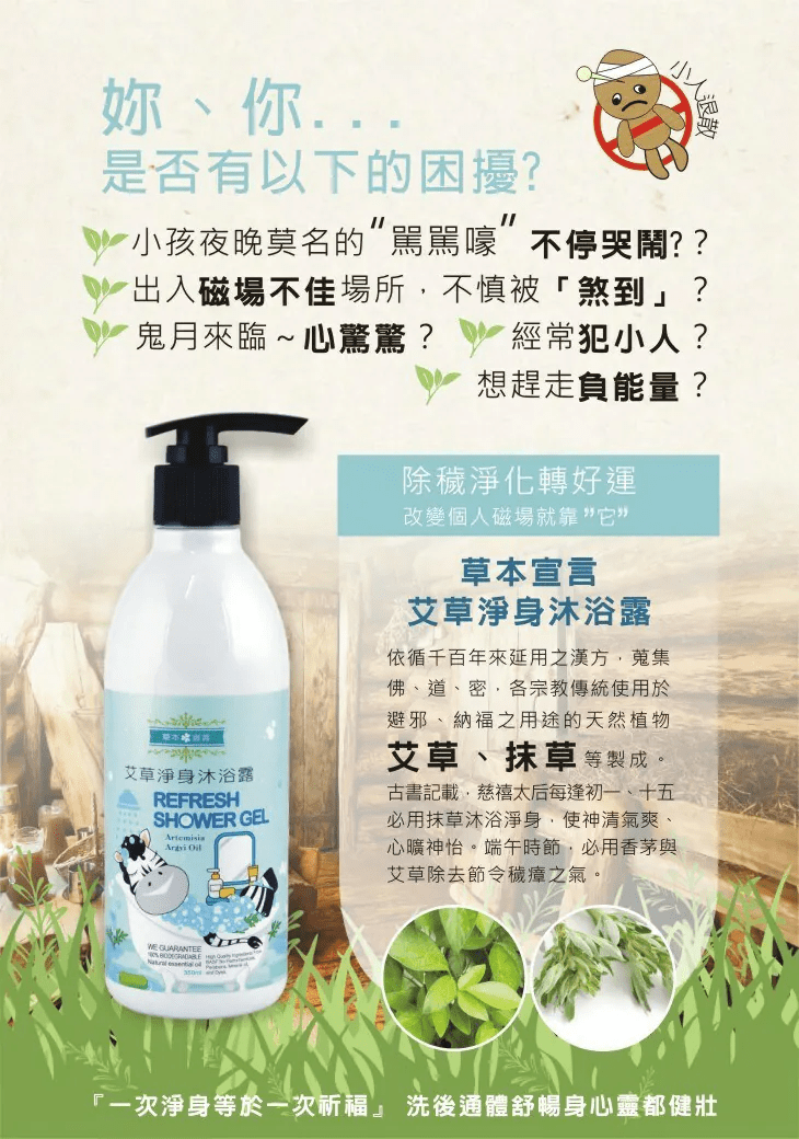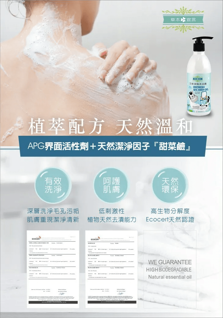 🔹萃取艾草與抹草精華,淡雅清新的芬芳氣息,洗去煩躁不安,帶來滿滿正能量。🔹以ECOCERT歐盟天然認證的椰子油、玉米等製成的APG®作為潔淨因子。🔹促進角質更新,使肌膚由內而外恢復光澤亮麗。🔹沐浴後給肌膚帶來柔嫩、舒爽的清新活力感受。