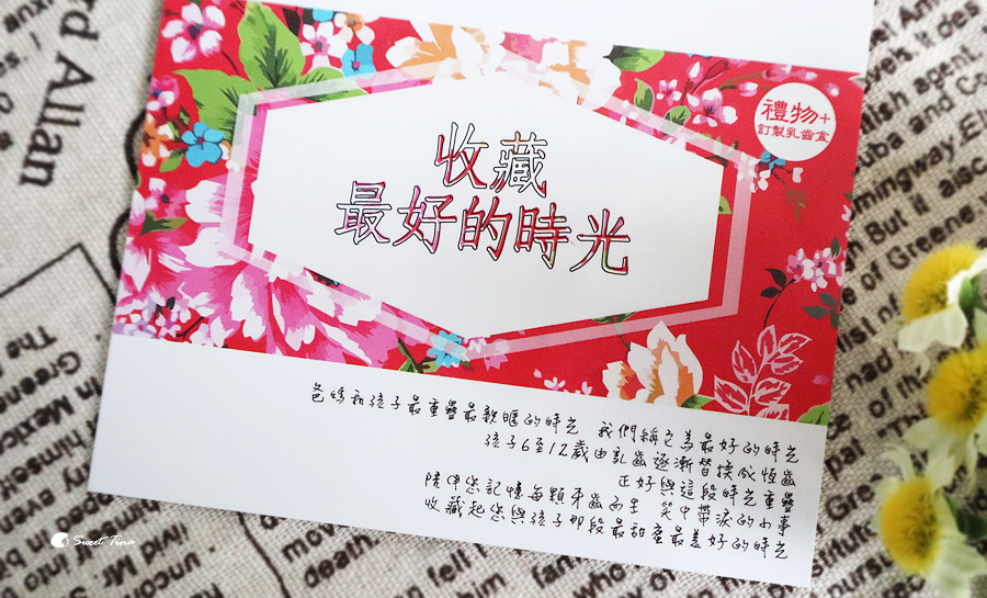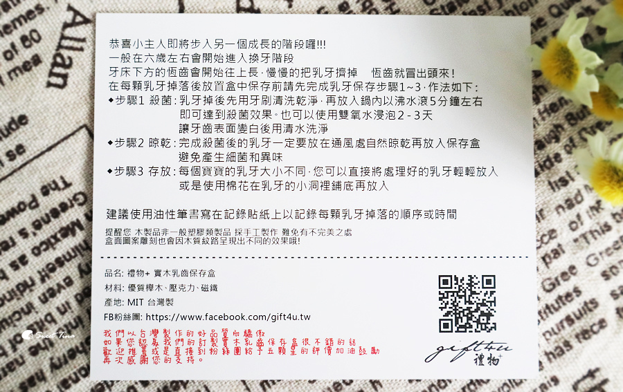 小卡的後面有提供如何保存乳牙的方法,Tina是將瑋兒拔下來的乳牙清洗後泡雙氧水三天,然後再用清水沖乾淨再晾乾,即可保存。