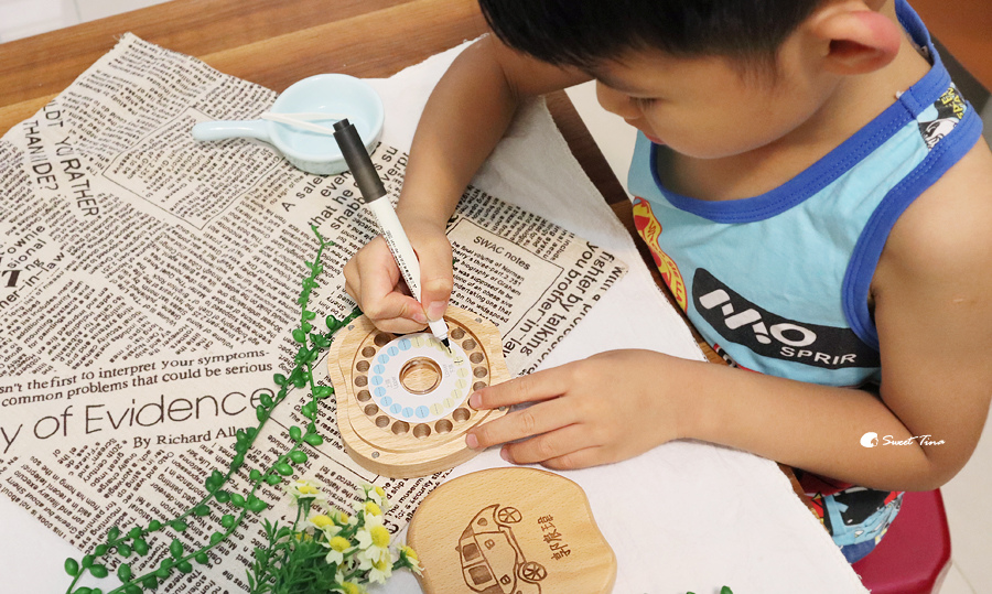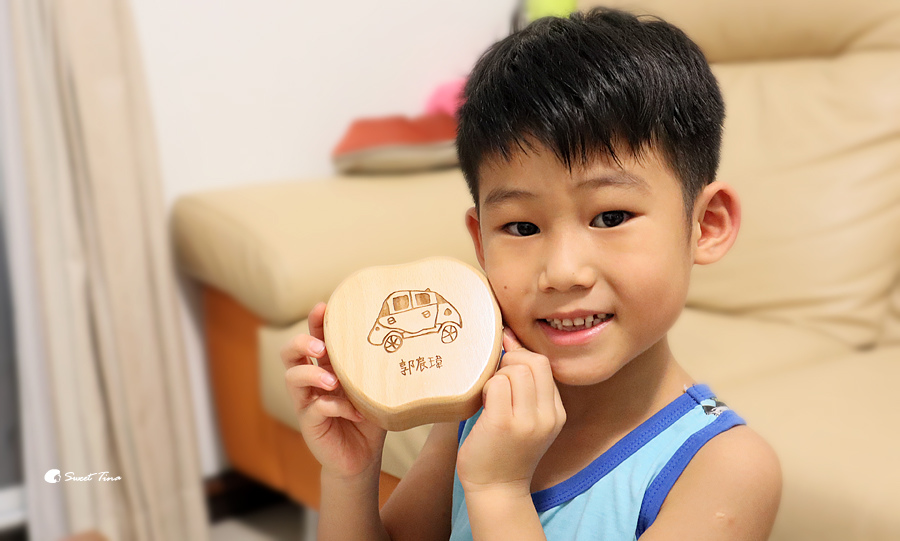 自從瑋兒知道自己手繪的車子和名字可以刻在乳牙盒上就好期待喔,收到乳牙盒後的他可是滿心歡喜,更是要求要自己收藏乳牙。